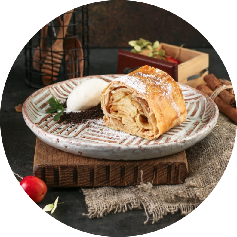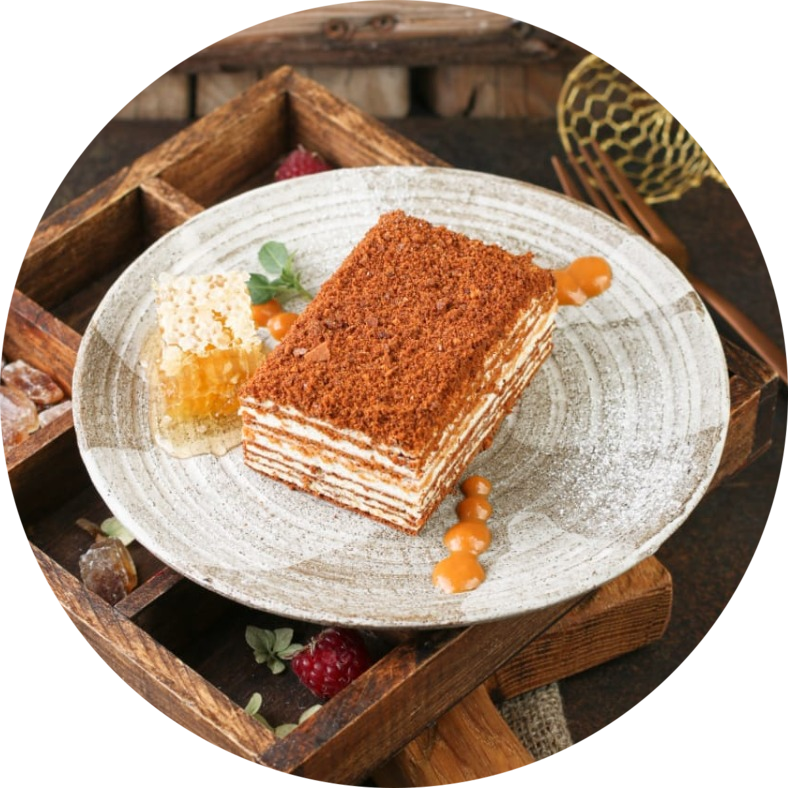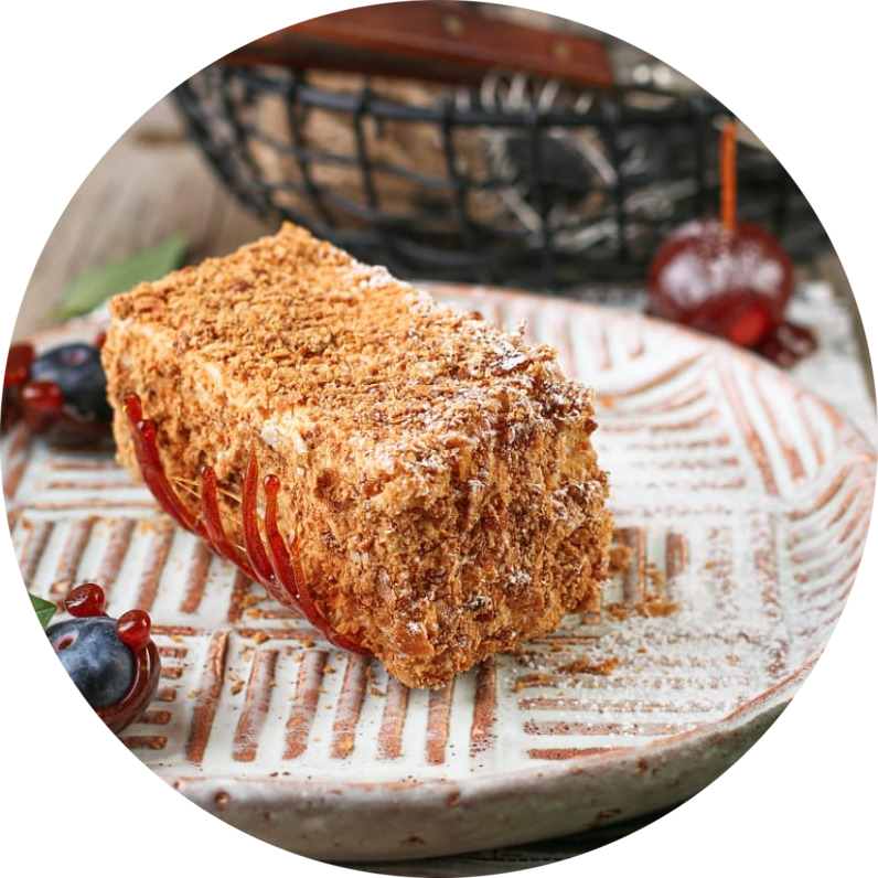 Неклассическая рецептура. Карамелизованное бездрожжевое слоёное тесто пропитанное сложным сливочным на заварной, желтковой основе кремом, щедро насыщенный томлёной грушей. Подаётся в классическом обсыпном варианте или в разрезе. К подаче - голубика, ежевика и карамель.
